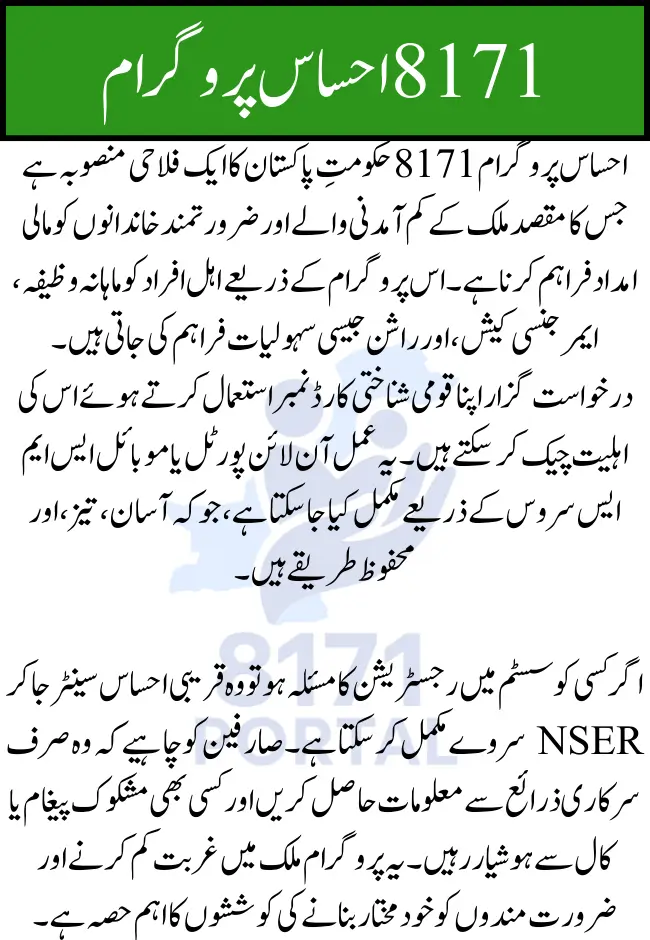 The Ehsaas Program 8171 is a social protection and poverty relief initiative by the Government of Pakistan. It offers direct financial support to deserving households across the country. The Ehsaas Program CNIC Check allows applicants to find out if they are eligible for assistance and when they can expect payment.