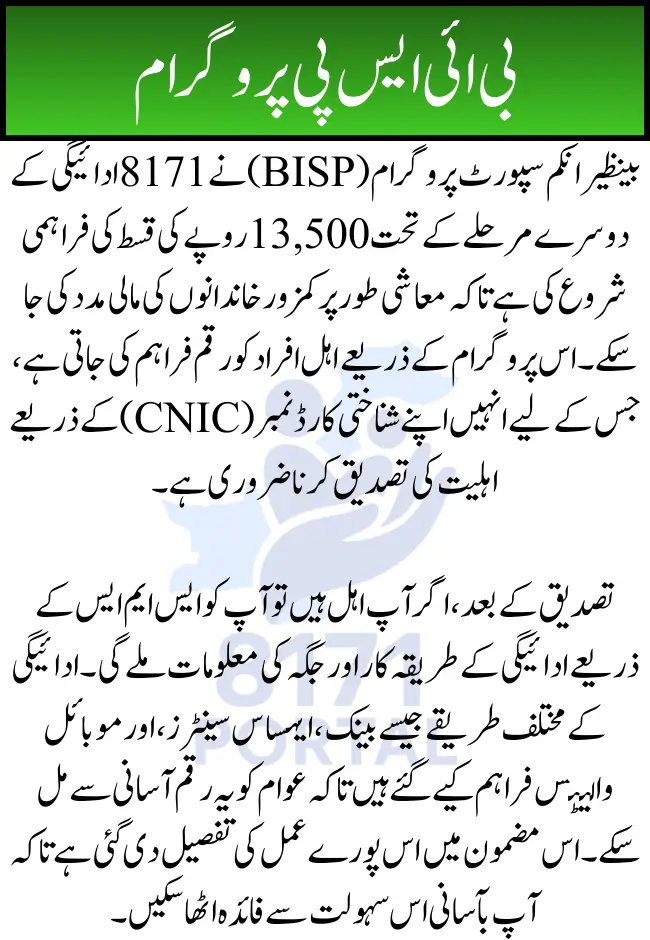 The Benazir Income Support Programme (BISP) has been a crucial support system for low-income families across Pakistan. With the introduction of the BISP 8171 Payment Phase 2, a new installment of Rs 13,500 is being distributed to eligible recipients. This installment is part of the government’s ongoing efforts to provide financial assistance to vulnerable families who are struggling to make ends meet. In this comprehensive guide, we will explain how you can verify your eligibility for 8171 Payment Phase 2 and access the funds without any hassle.