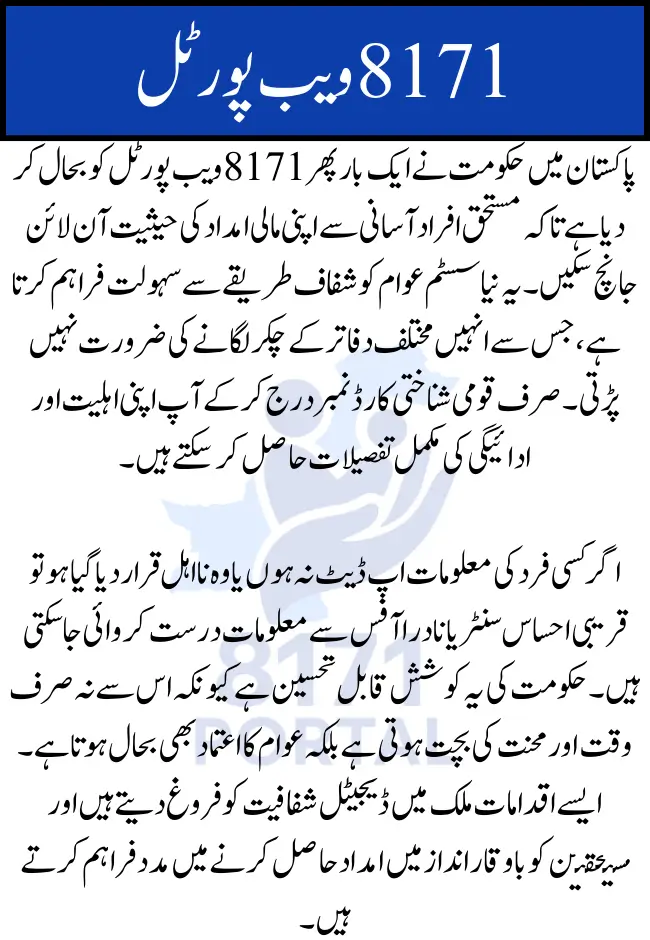 In a major digital development, the 8171 Web Portal Launched initiative has been reintroduced by the Government of Pakistan to help citizens conveniently track their financial assistance status online. This updated portal is part of ongoing efforts to make welfare programs like BISP and Ehsaas Kafalat more accessible and transparent for the public.