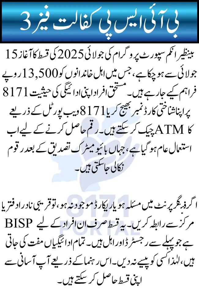 The launch of BISP Kafaalat Phase 3 marks another vital step in the government’s mission to strengthen social protection in Pakistan. With the disbursement of Rs. 13,500 to verified beneficiaries and the release of an updated, transparent beneficiary list, this phase aims to reach even more deserving families. By using the 8171 portal, citizens can easily check their eligibility and avoid misinformation.