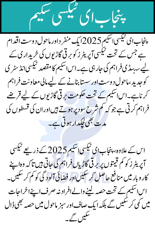 | Eligibility Requirements | Operational taxi service, Punjab residency, electric vehicle purchase |