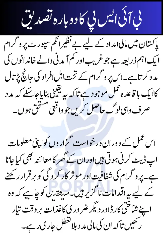 The reverification process plays a significant role in strengthening Pakistan’s social welfare system. By ensuring that only eligible families receive financial aid, the program maximizes its impact and reduces resource wastage. This verification helps uplift the poorest segments by focusing funds where they are truly needed, which supports poverty reduction efforts nationwide. Moreover, the process fosters public trust in government assistance programs by promoting transparency and accountability. When beneficiaries comply with the reverification, it guarantees the program’s sustainability and benefits future generations.